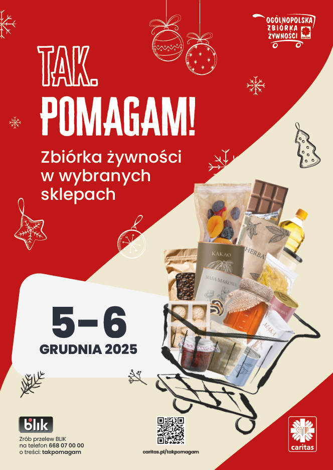 Caritas Diecezji Pelplińskiej rozpoczyna przygotowania do kolejnej edycji ogólnopolskiej zbiórki żywności „Tak! Pomagam!”, która odbędzie się 5–6 grudnia 2025 r. Tradycyjnie zapraszamy wszystkich koordynatorów oraz wolontariuszy do udziału i rejestracji.